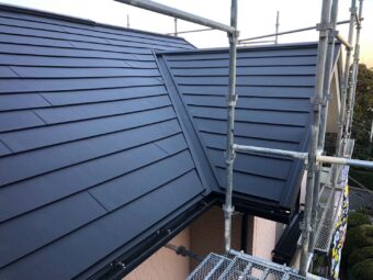 既存トタン瓦棒屋根を解体しIG工業のスーパーガルテクトを施工致しました。既存屋根が2寸勾配とスーパーガルテクト施工不可の