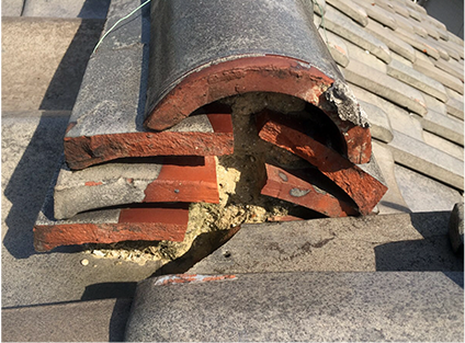 強い風によって、 瓦がズレる・雨どいが外れた、雹(ひょう)が降って穴があいたなど。