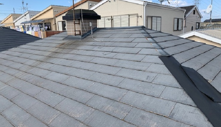 今回は、大阪府東大阪市で行った屋根のカバー工事をご紹介します。今回ご紹介する屋根は、台風の強風によって屋根の棟板金が剥がれてしまったための修理工事です。現地調査を行った所、棟板金以外の既存屋根材も、経年劣化が進んでいたため、今回は、ケイミュー社が販売する軽量な金属屋根素材『スマートメタル』でのカバー工事をご提案させていただきました。